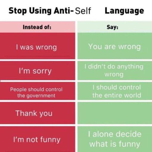 Can't I be anti-other-selves? Instead of saying: I was wrong. | Fuck you. | I'm Sorry. | Fuck you. | People should | Control the | Fuck you. Government. | | Thank you. | Fuck you. | I'm not funny. | Fuck you.It’s hilarisad that we all know who this is about