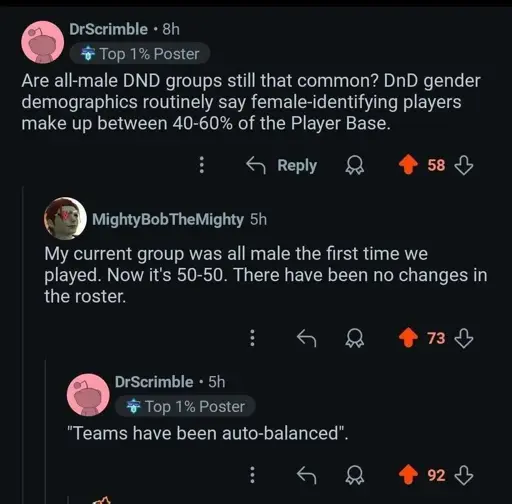 I used to only have one (seemingly) female friend, and then that friend transitioned, and I started to worry what it said about me that I only had male friends. Fortunately, a year or two later most of my other friends transitioned in the other direction and balance was restored.