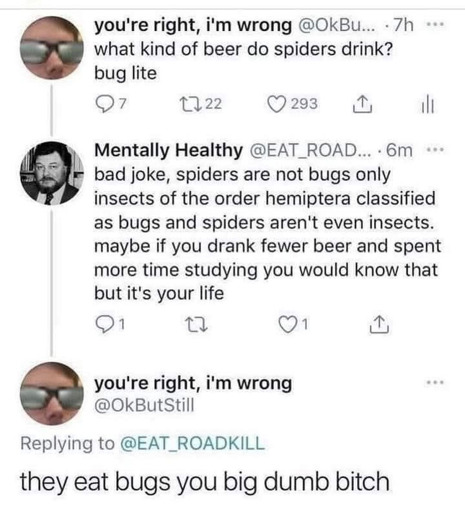 bad joke, spiders are not bugs only insects of the order hemiptera classified as bugs and spiders aren’t even insects. maybe if you drank fewer beer and spent more time studying you would know that but it’s your life