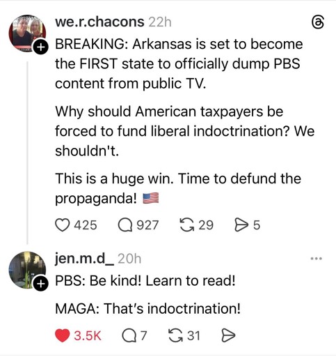 None of these chuds have ever watched a minute of PBS in their adult lives.