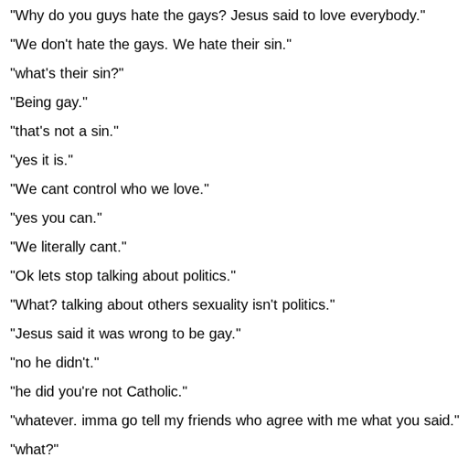 Let’s say, for the sake of argument, being gay is a sin. Isn’t one of Jesus’ more well known lessons “let he who has never sinned throw the first stone” or something like that? Like his main thing is forgiving people and providing unconditional love. I’d say focusing on someone’s perceived sin is straight up non-Christian
