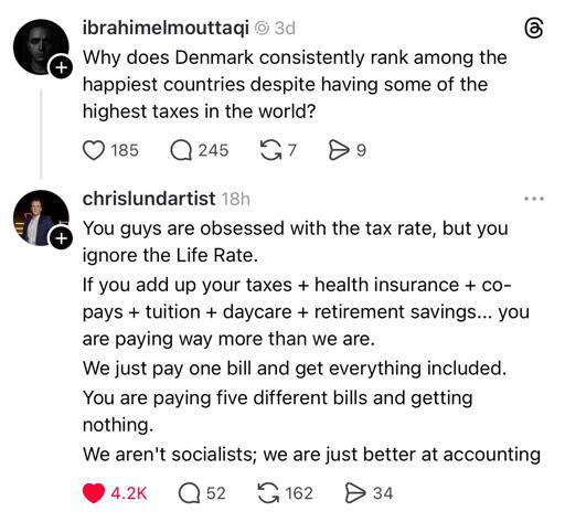 I wonder if the first guy is just engagement farming or genuinely confused. Either way, there probably are plenty of people who are so “brainwashed” that they can’t fathom that “happiness” and “tax rates” aren’t linked by some law of nature.