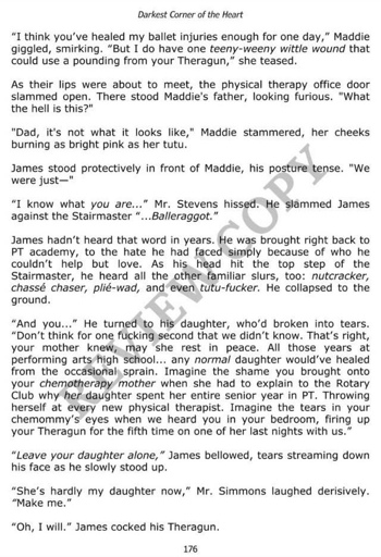James hadn’t heard that word in years. He was brought right back to PT academy, to the hate he had faced simply because of who he couldn’t help but love. As his head hit the top step of the Stairmaster, he heard all the other familiar slurs, too: nutcracker, chasse chaser, plié-wad, and even tutu-fucker. He collapsed to the ground.