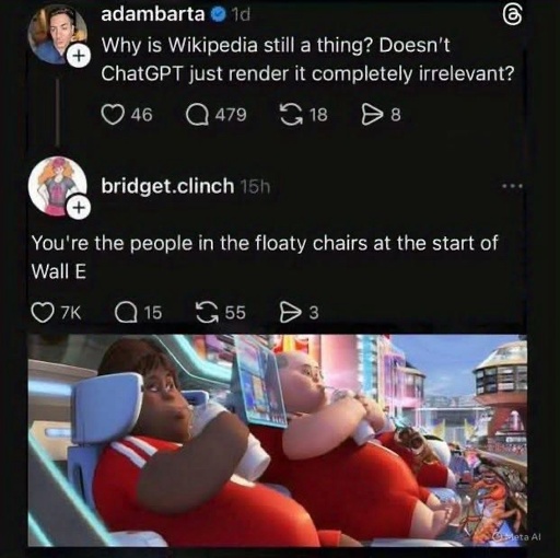 I think you fell off your hover chair, spilled your milkshake and had a brief moment of clarity … don’t worry the robot assistants will help you back up and put you back in your chair