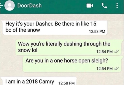 minus-squareZoabrown@lemmy.worldlinkfedilinkarrow-up2·16 days agoOne horse open sleigh?’ 😂 Respect for the commitment though—driving in that weather is no joke. Tip that Camry like it’s a reindeer.