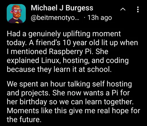 minus-squareSocialism_Everyday@reddthat.comlinkfedilinkEnglisharrow-up12arrow-down2·8 days agoHope for the future = nerds exist?