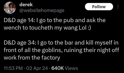 PugJesus@piefed.social to RPGMemes @ttrpg.networkEnglish · 1 month agoSome days you wake up and choose violencemedia.piefed.socialimagemessage-square12linkfedilinkarrow-up1278arrow-down118