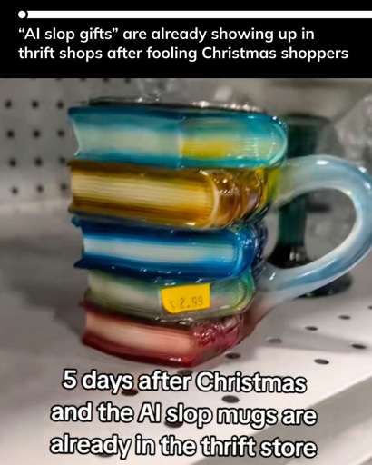 ickplant@lemmy.world to Fuck AI@lemmy.world · 28 days agoAI slop mugs hitting the thrift store shelveslemmy.worldimagemessage-square27linkfedilinkarrow-up1234arrow-down12