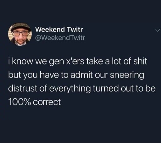 GenX has never held any type of power, nor will they ever - not political, not economic, not financial. The Boomers were always like “Wait your turn”, but they never bothered turning anything over regardless of what we fought for, or how hard.