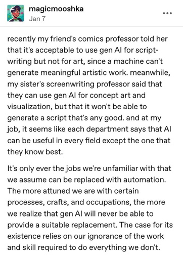 recently my friend’s comics professor told her that it’s acceptable to use gen Al for script- writing but not for art, since a machine can’t generate meaningful artistic work. meanwhile, my sister’s screenwriting professor said that they can use gen Al for concept art and visualization, but that it won’t be able to generate a script that’s any good. and at my job, it seems like each department says that Al can be useful in every field except the one that they know best.