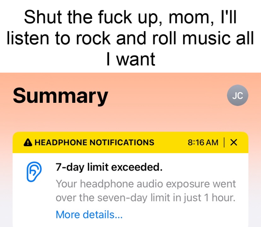 What? Is this a volume control limit, then? I thought it was just a parental feature that caps how often they can listen to music on their earbuds (which seems absolutely insane to me), but I guess volume control would make a bit more sense.