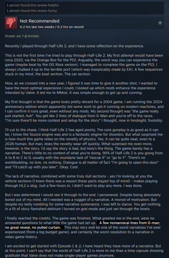 I once saw someone somewhere comment that HL2 is actually a tech demo meant to show off the physics stuff. Which I wholeheartedly agree with, and even that didn’t win me over. The game doesn’t feel like a shooter meant to be enjoyed, rather it feels like Valve flexing its muscles only because they can.