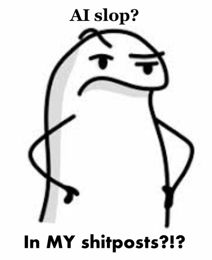 Well, copying and pasting someone else’s shitpost is probably the lowest effort you could do, besides telling someone else to do it. AI is barely above copying and pasting so it fits within the accepted level of effort for shitposting, it meets every criteria, no where does it say shitposts have to be OG content, so AI shitposts are shitposts and shit posts, much like half the shit posts on this shitposting shit post.