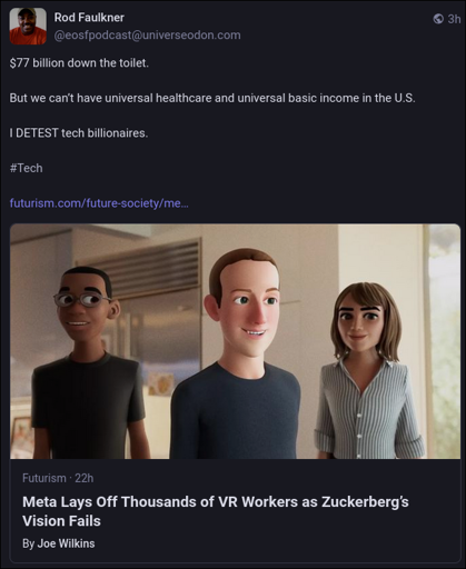 It is weird that nobody pointed out to him that a meeting in VR is worse than a Zoom call in every practical way. I guess he reached the “surround yourself with Yes-Men” stage too long ago.