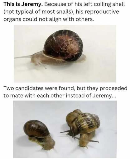 I think this species of snail is assymetrical, which means maybe their genitals are on the right side of their body. But a snail that coils like Jeremy has their symmetry flipped and their genitals are on the left. So Jeremy wouldn’t be able to reproduce with a typical right coiling snail because their organs don’t align. So yeah all three snails coil to the left because that’s a rare trait and needed for mating