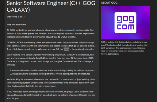 mr_MADAFAKA@lemmy.ml to Linux Gaming@lemmy.worldEnglish · 21 days agoGOG is seeking a Senior Software Engineer with C++ experience to modernize the GOG GALAXY desktop client and spearhead its Linux developmentlemmy.mlimagemessage-square167linkfedilinkarrow-up11.15Karrow-down17file-text