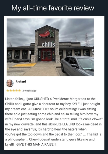 Funny cause I had almost the same discussion last week, in a similar post. And will probably have it next week when a young woman who just broke up with her boyfriend will write a wholesome review about getting offered free fried chicken by the manager of fast food restaurant when they realized they both have a goldfish name Billy. https://sh.itjust.works/post/53828922
