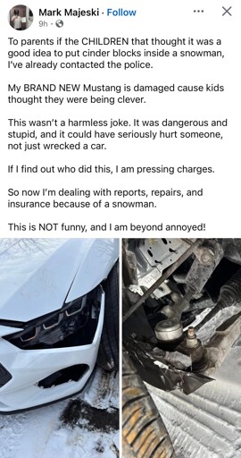 Did they build this snowman in a roadway? If so, he has a case but “could’ve” (should’ve) avoided the obstacle… If the snowman was not built in a roadway: gtfo