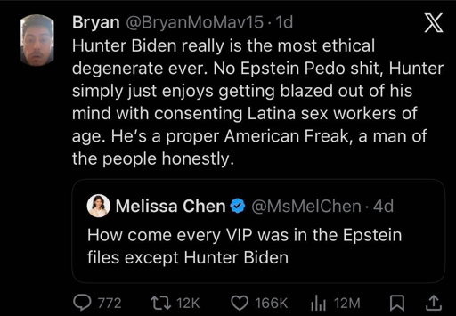 Fuck Hunter Biden. Fuck this person on Twitter. Death to America and all their politicians, billionaires and failsons.
