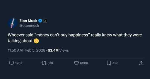 Hey dude. You know what can buy happiness? Compassion, generosity, being of service, creativity, a healthy lifestyle, and staying far away from toxic people like your Trumps, Epsteins, etc. Your conquests and financial success are empty. You see that. Divest. You will live comfortably for the rest of your life now, or pursue endeavors purely for the love of it, or the creative outlet. And you can use that time and money making amends, bettering the lives of everyone around you. Feed the hungry, house the poor, pay for the education and betterment of others, use your influence to benefits those without influence. Empower others to be comfortable too. I promise you that you will feel 10000 times better about yourself, and the people around you will love you for it.
