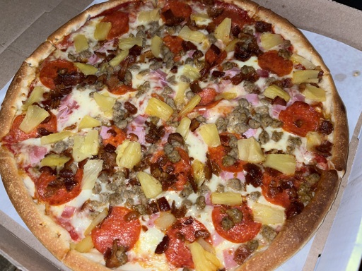 “Sausage, pepperoni, bacon, ham” and I just custom added pineapple