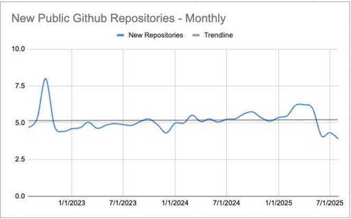 Your response seems very enterprise-focused. I think you might be missing the kind of software development that happens before it becomes enterprise. All of these metrics are very reasonable for new products, startups, consulting, and hobby hackers. If code were moving 10X now, we should reasonably see 10X new growth. These numbers show we’re not.