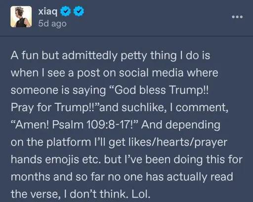 Thanks. It seems to me that the Bible thumping crowd would see it was Trump is the one being attacked and the remainder of the passage would be against his enemies, rather than the intended implication that Trump is the enemy.