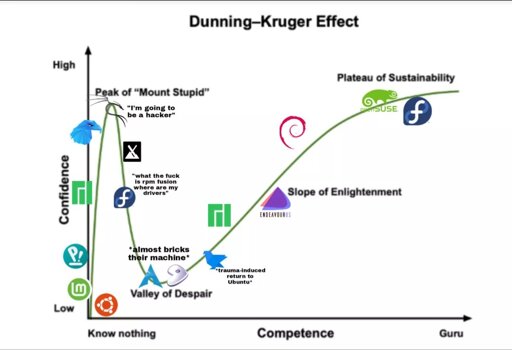 Alt text: A line plot with 2 axis (confidence vs competence) referencing the Dunning-Kruger effect with various distro logos placed at different points on the line. Starts with mint/ubuntu near (0,0) and progressing through multiple distros to end up with opensuse/fedora at what it calls “the plateau of sustainability”