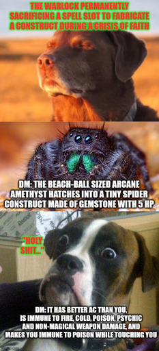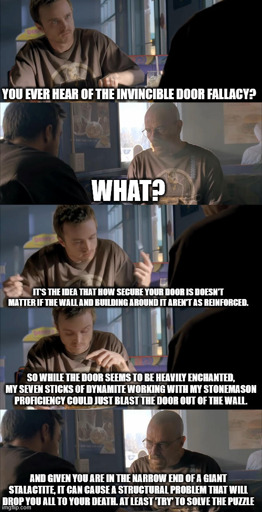 6·29 days agoSo the door itself had a sorta embossing design of an incomplete web. You would have to complete the webbing but there is a trap part that, if connected, triggers active, offensive traps. With a good investigation roll, my arcana and a Web spell from the rogue’s cloak, we did the puzzle and the door opened itself
