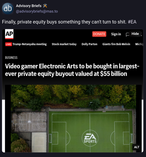 nothingcorporate@lemmy.todayOPtoPolitical Memes@lemmy.world•Boost, repost, & share: Boycott Disney39·16 days agoBecause they buy up companies more often than normal people buy milk.