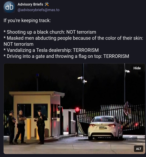 nothingcorporate@lemmy.todayOPtoMicroblog Memes@lemmy.world•I don't think that word means what you think it meansEnglish36·17 days agoThe (presumably) Feds in the picture standing around with their arms crossed looking at the minor damage to the gate don’t look that terrorized to me, but what do I know, I’m not a big brain cop.